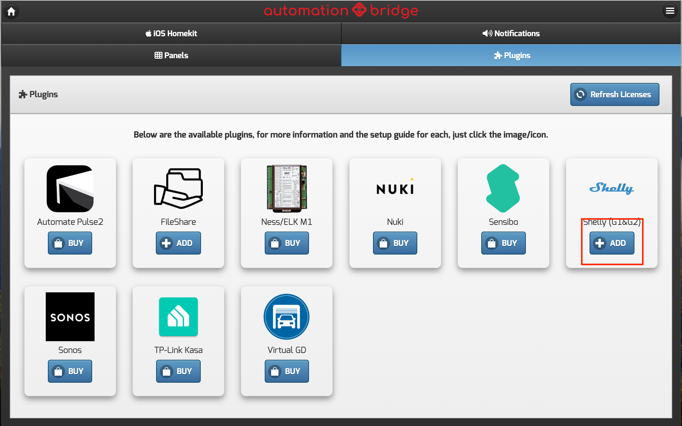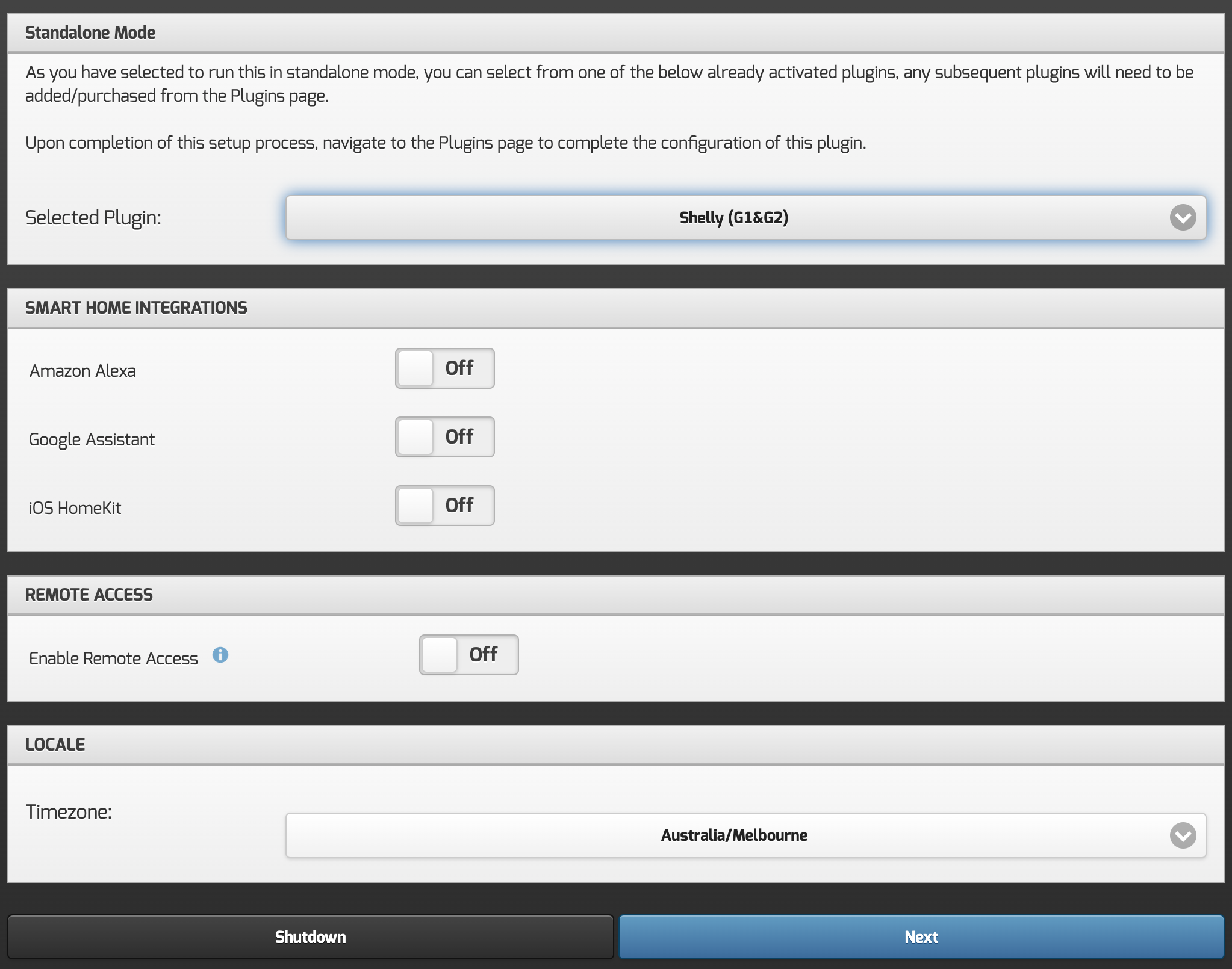 Select the Shelly (G1 & G2) plugin from the drop down list