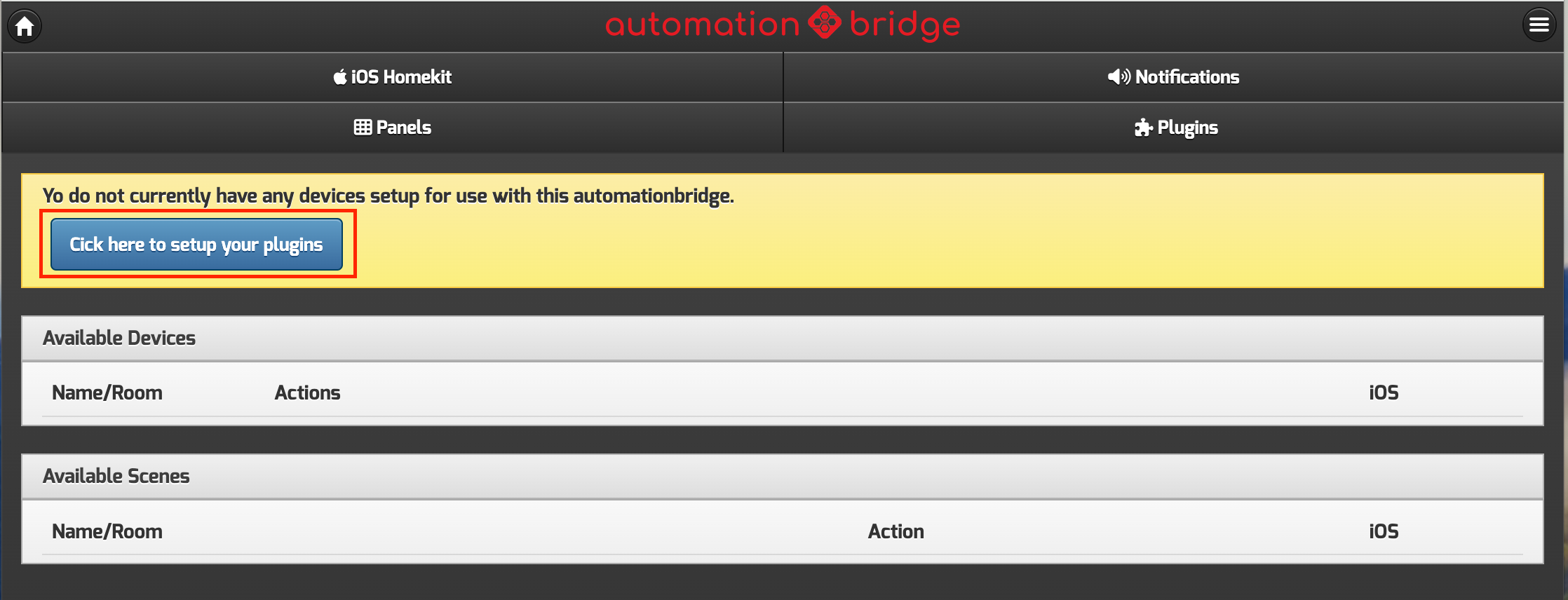 Once rebooted, log into the automationbridge, and you will be presented with the home page, here it will advise that you need to setup the plugin, click the button to proceed.