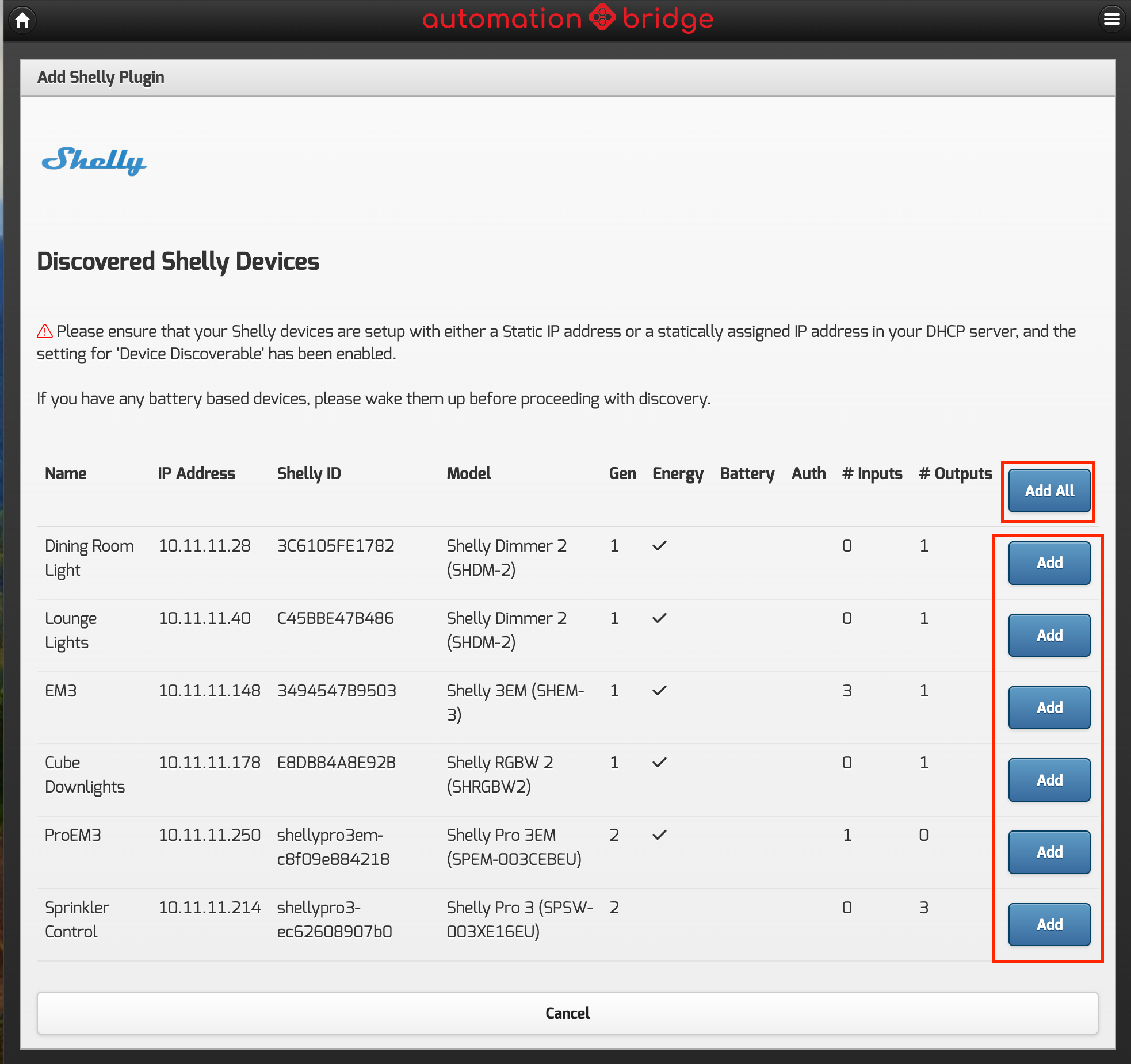 Click Next to proceed to scan your network and present the list of Shelly modules, you can choose to Add them all at once, or one by one as needed, eg