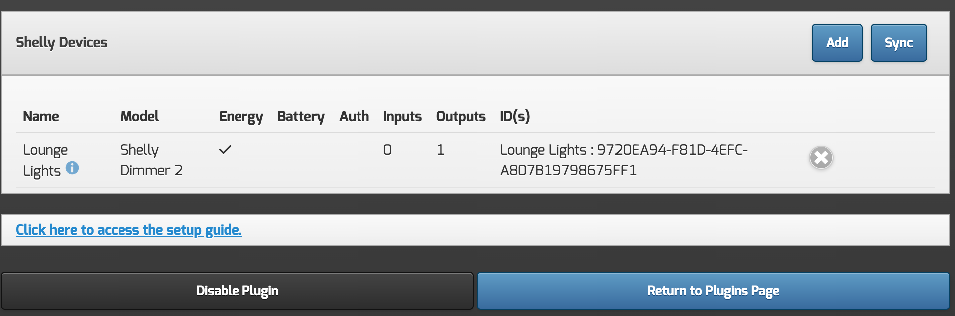 Click OK to complete this process, and you will be taken to the Shelly settings page, from here you can Re-Sync and add additional Shelly devices as required.