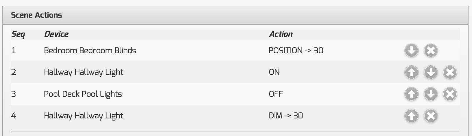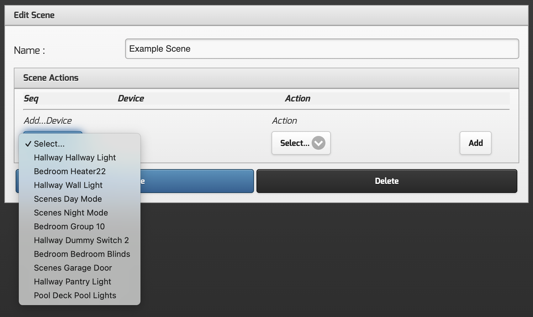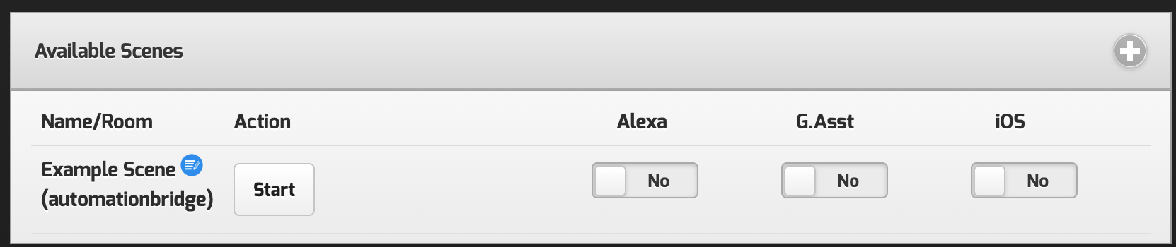 This scene is then available via the Home Page to enable for Voice Control, to be selected from the Home/Away module, and also as a trigger for the Voice Notifications module.