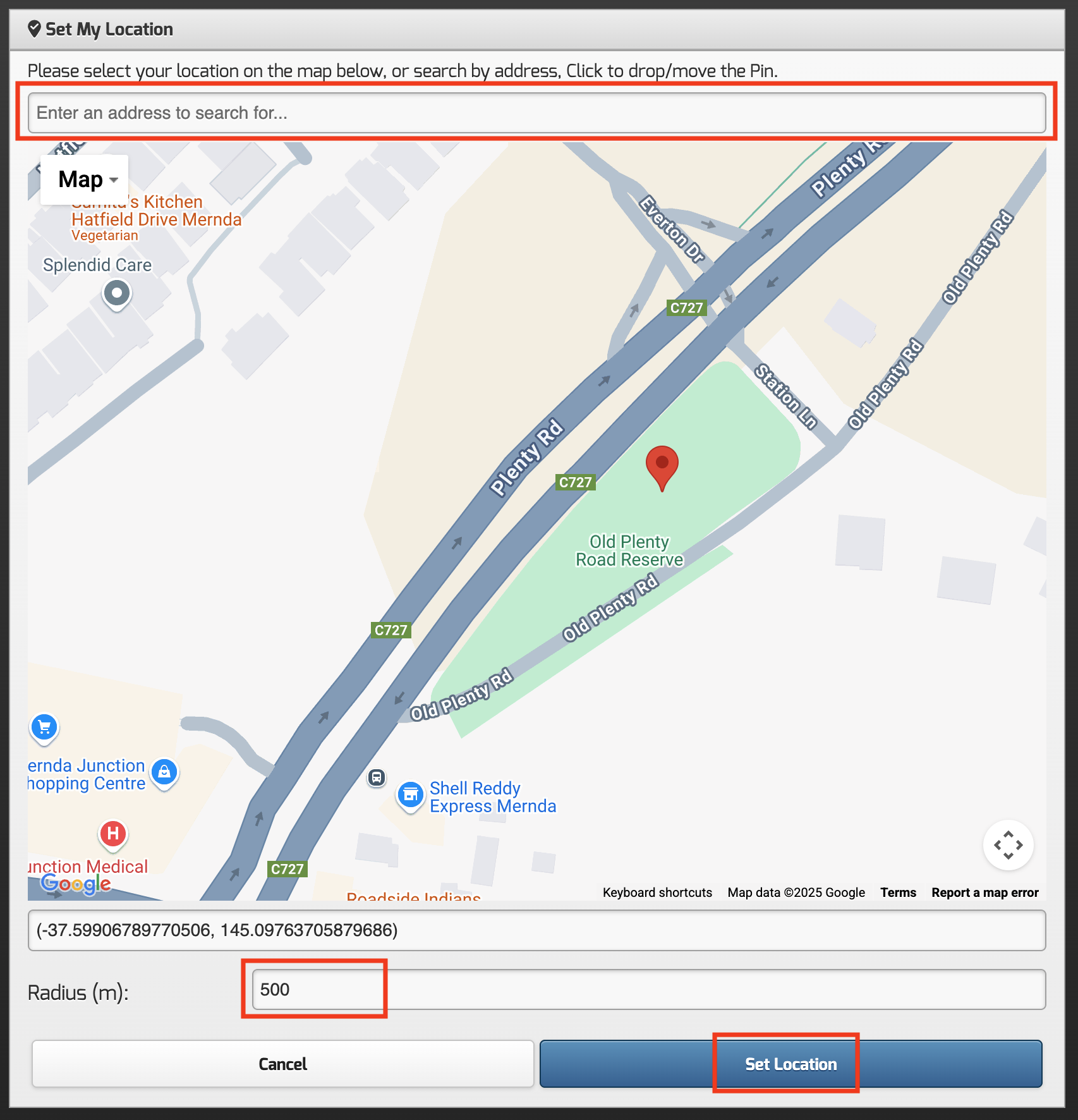 Step 3 - Enter your address, or select your location from the map on screen, zooming in to your location and then a single click will drop a Pin on the map, you can also adjust the detection radius, the default is 500m. Click the Set Location button when you are done.