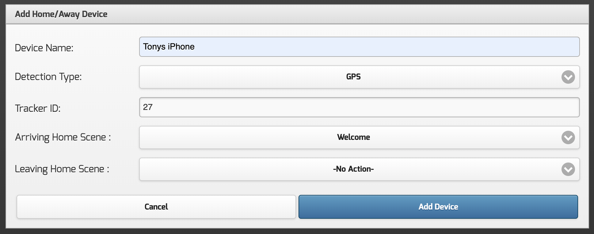 Step 6 - Enter a name for this device, detection type will always be GPS. The Tracker ID will be automatically generated, this is a unique identifier for your device. Then select the scene you wish to run when arriving and leaving the Home area. Click Add Device when done.