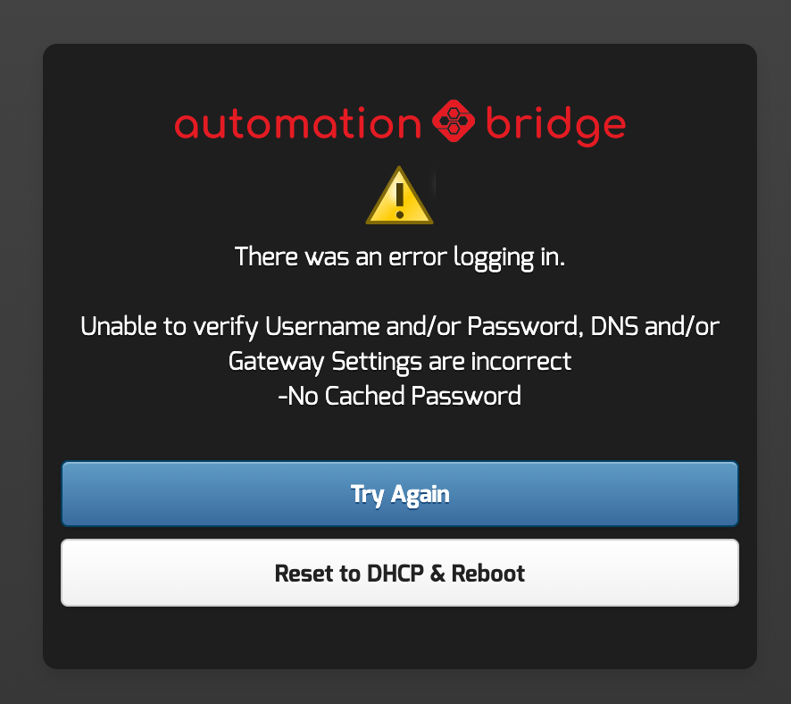 If after the reboot of applying the settings, you are unable to log in, and the following error is displayed, which means that the automationbridge cannot reach the authentication server, and unable to use a cached password to login, you can choose to Reset to DHCP and reboot, to do this click the button as below.