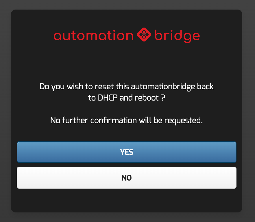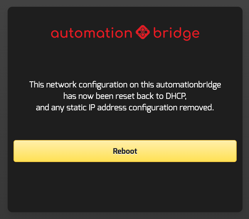 As from v2023.11 of the automationbridge, a new feature has been added that will allow you to reset the bridge back to DHCP if incorrect IP address settings are entered for the DNS and/or Gateway.