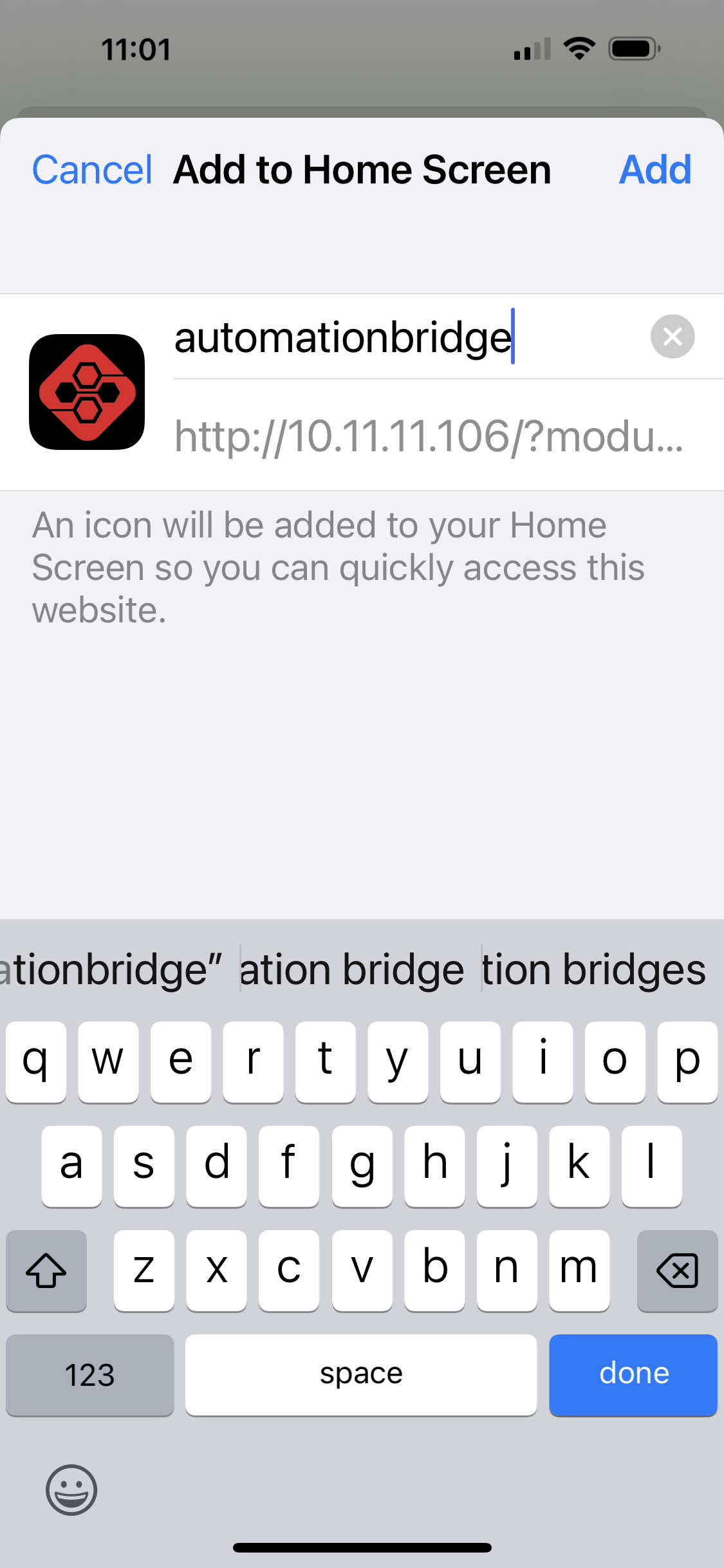 This feature allows you to add the automationbridge interface as an app to your iOS and Android devices. It will show as a native app on your device, with the icon and will launch into a full screen view.