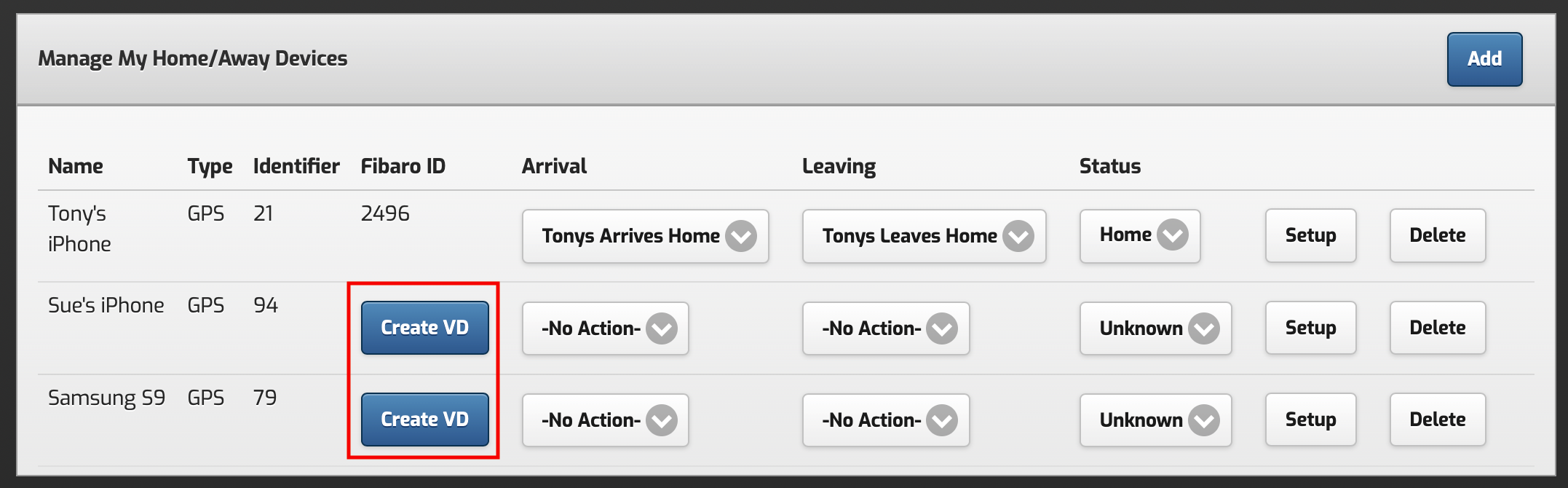 If you already have a device setup, and want to add the status tile (VD) then there is a new button to create the VD for you on the Manage My Home/Away Devices page.