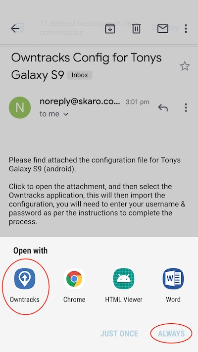 Step 5 - In the 'Open With' popup, select OwnTracks and then press on the ALWAYS link.