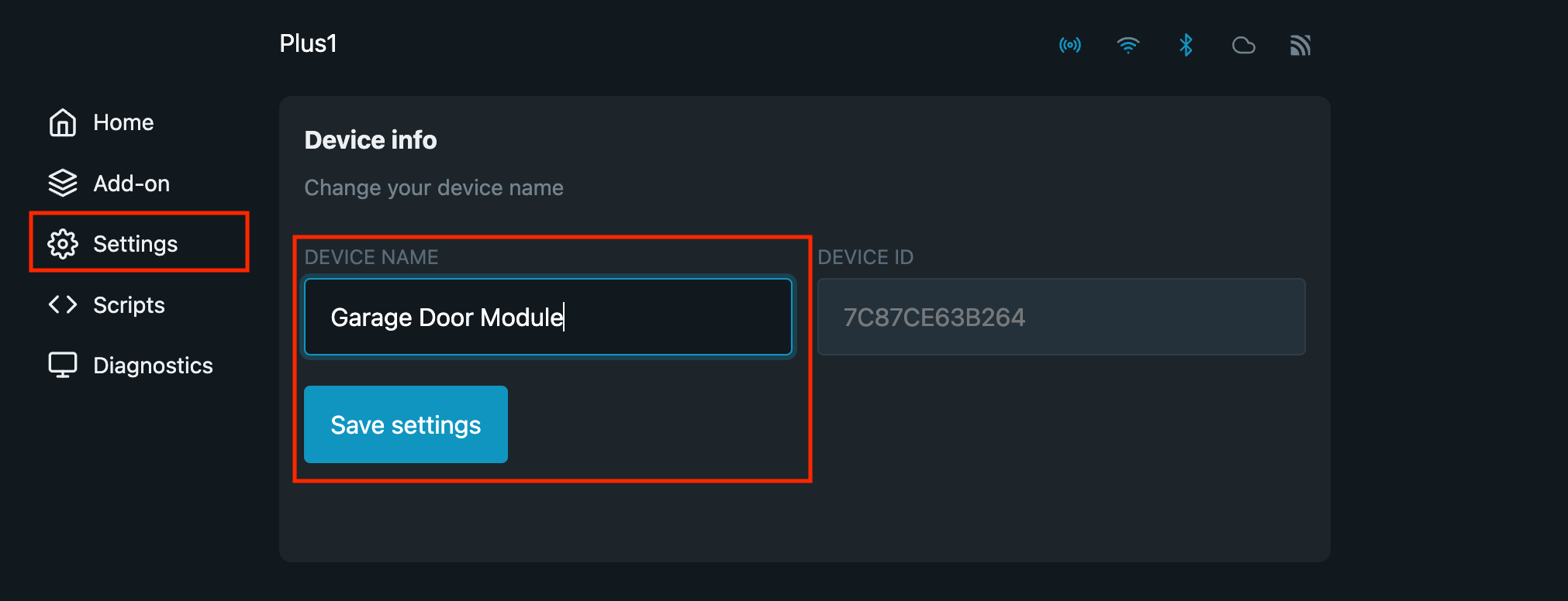 Step 1 - Give the Module a name, to do this open the web interface of the Plus 1, click Settings, then Device Info and enter a name, eg Garage Door Module (note: do not call the device the final name of the Garage Door, as this will conflict later when setting up the Virtual Garage Door Plugin)