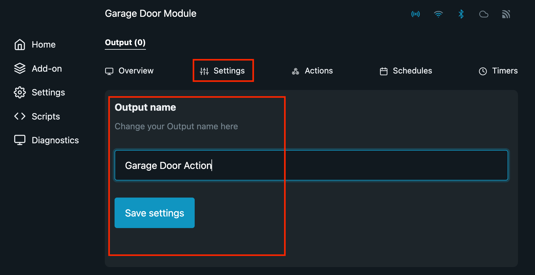 Step 3 - Click Setting, then Output Name, and give the Output a suitable name, eg Garage Door Action