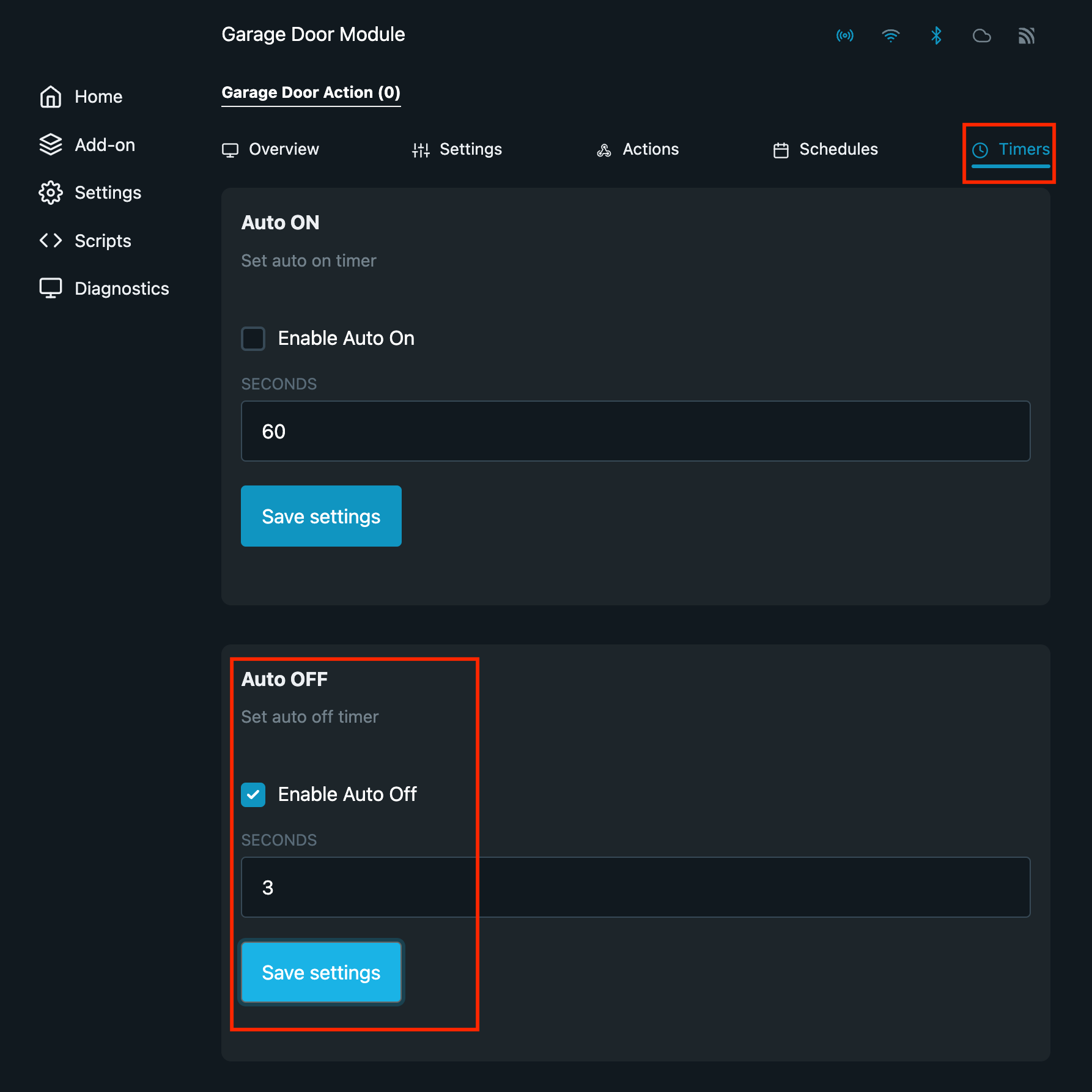 Step 4 - Now we need to configure the output as a pulse for 3 seconds, this emulates the same action as a physical wall button, click the Timers link, then Enable the Auto OFF and set to 3 seconds, and Save.