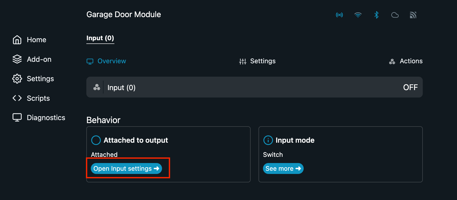 Step 5 - Now we need to remove the association between the output and input of the Plus 1 Module, this allows the Input to be used for the Garage Door Sensor, to determine if open of closed. Go back to the Home page, then click on the Input (0) link, then click the Open Input settings button.