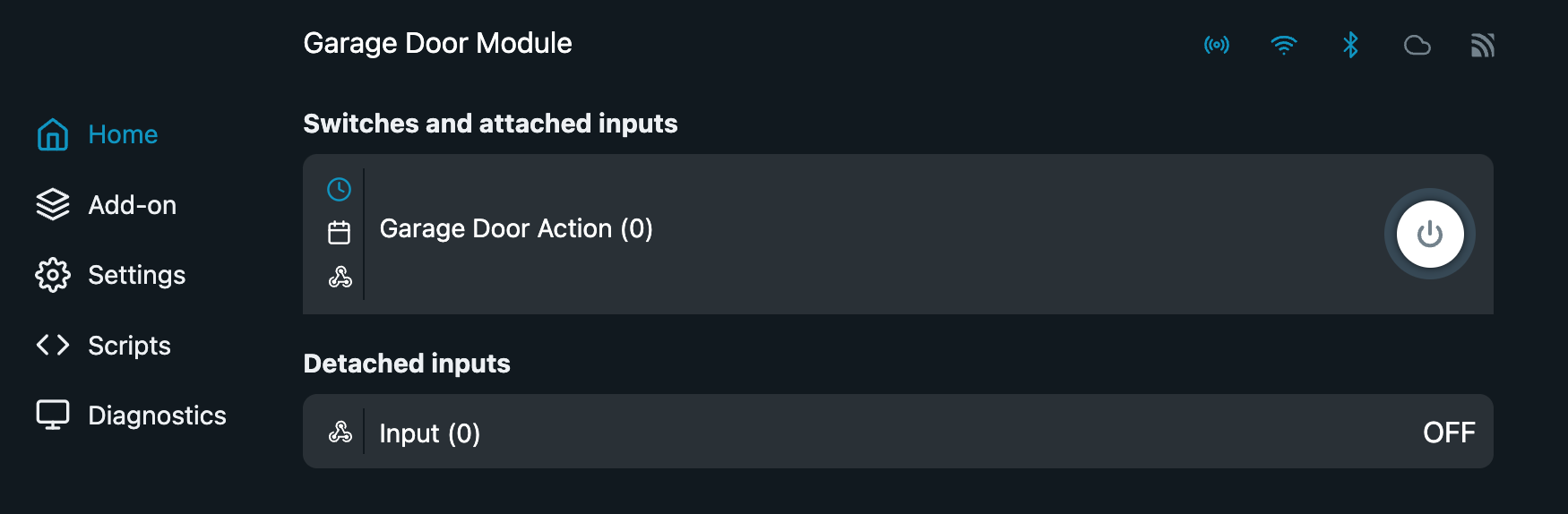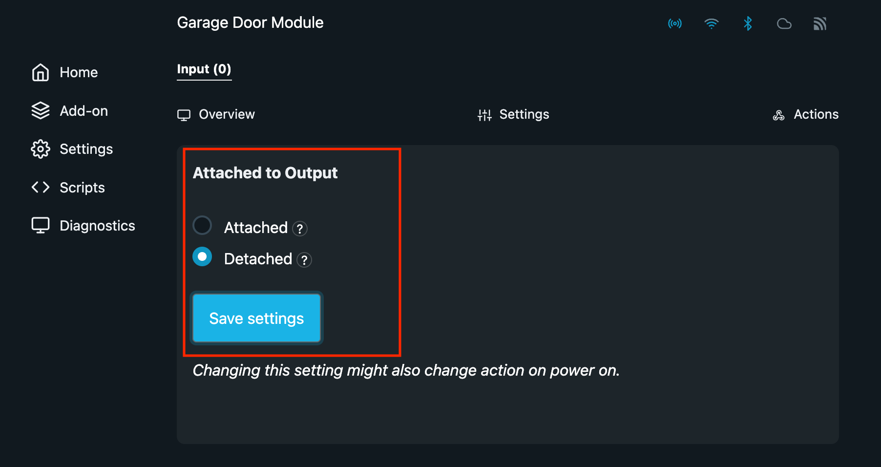 While you are adjusting the settings for the module, we also recommend to adjust the power on setting, this will ensure that the garage door does not automatically open after a power failure, to do this under Settings, edit the Action on power on and set this to Restore last.