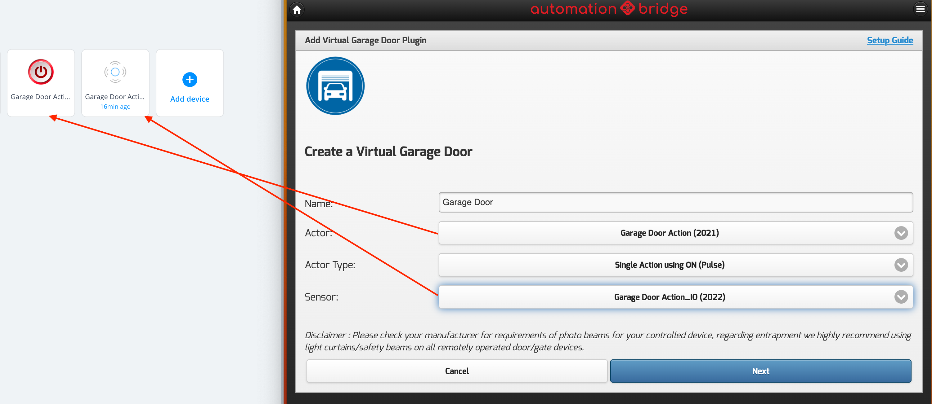 The Shelly Plus 1 can be configured to function as a Garage Door controller, along with the Virtual Garage Door plugin within the automationbridge.