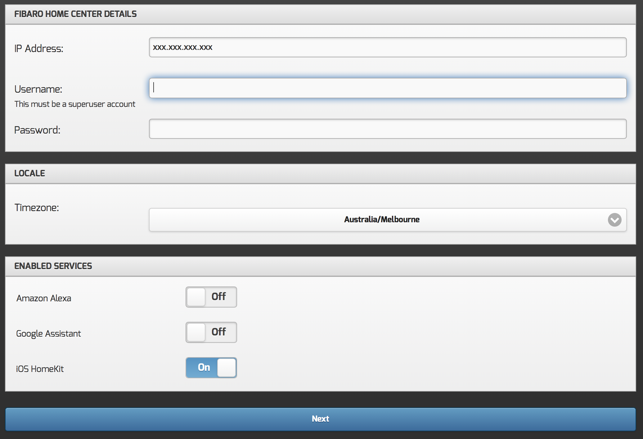 Next, enter the details for your Fibaro controller, select your time zone, and enable the required services.