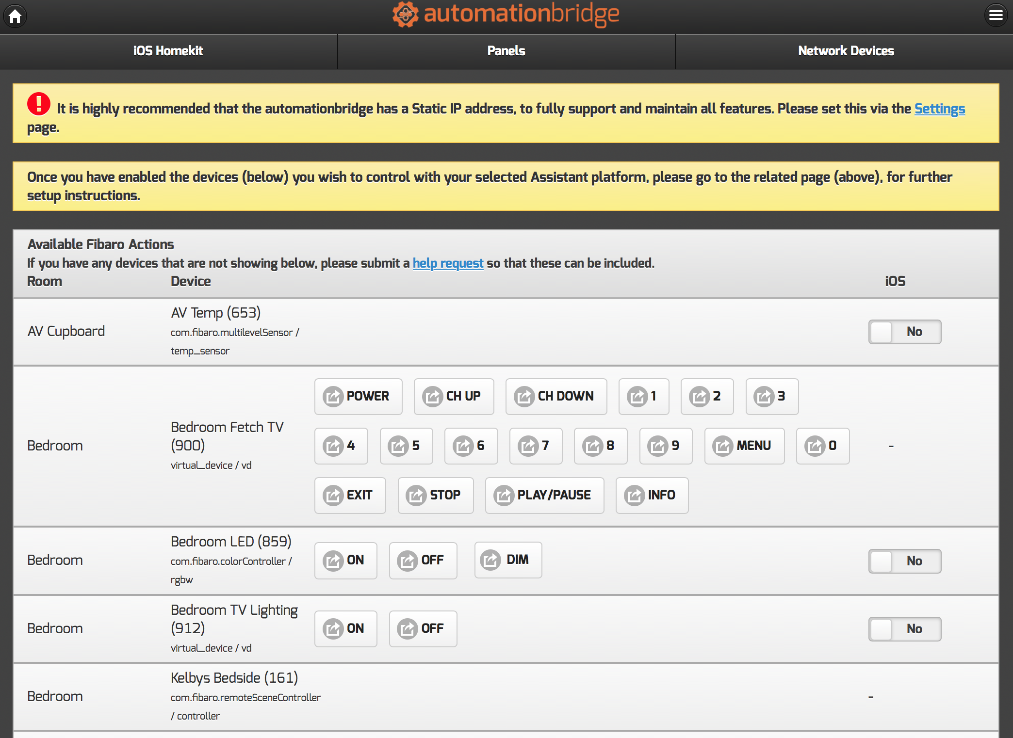 Once the bridge has restarted, you can then enable the required devices from the home page by clicking the slider to enable as needed, when all devices have been enabled, make sure to click the button to apply the changes.