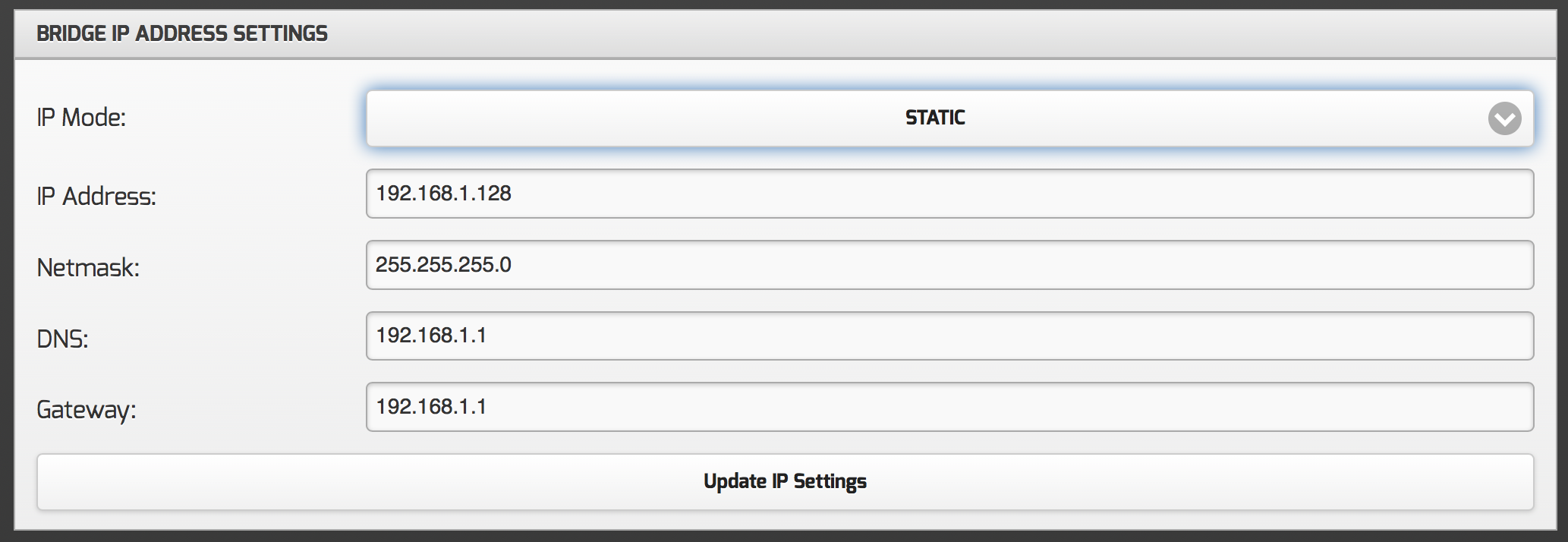 It is highly recommended that you set a static IP address on the bridge, this can be actioned from the Settings page, change the IP Mode dropdown to STATIC and ensure that the correct network settings are entered as below.
