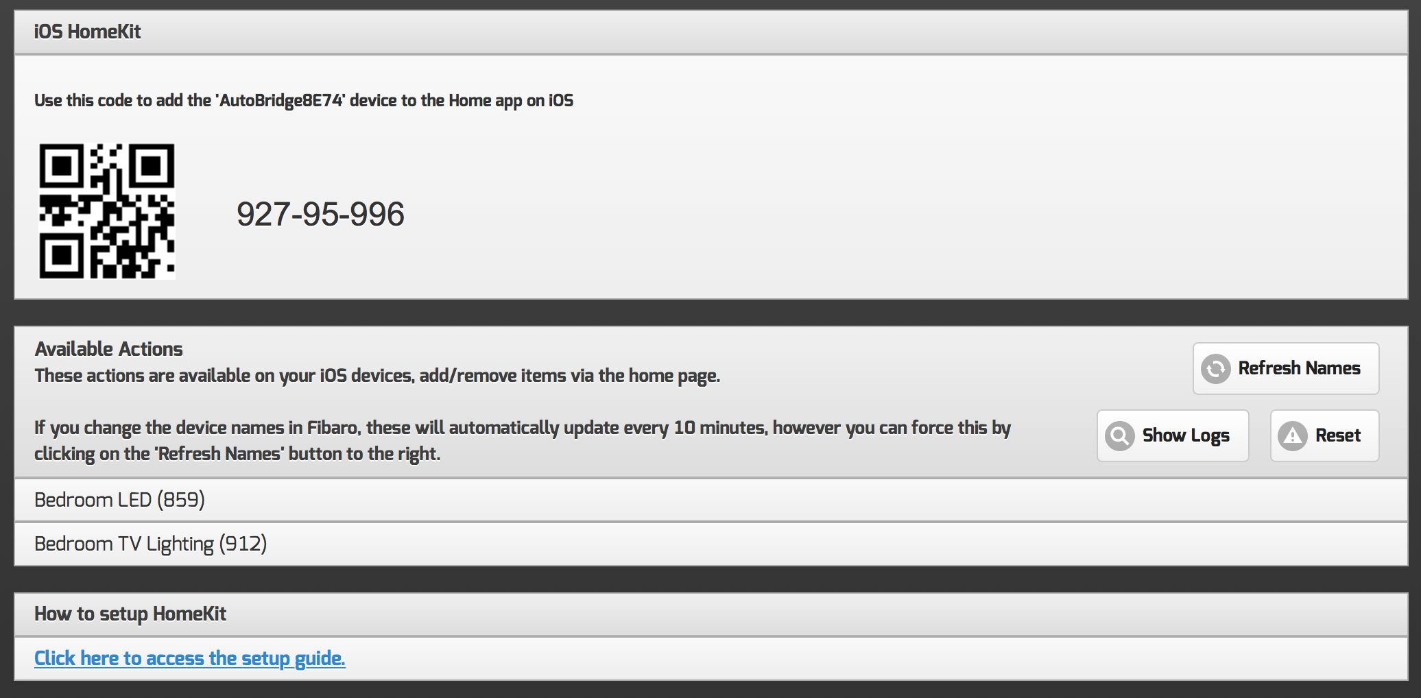 Reset – This will reset the Homekit backend, disabling all devices, and generating a new code. If this is done, you will need to remove the old AutoBridgeXXXX from your Home app and re-add it using the new code.