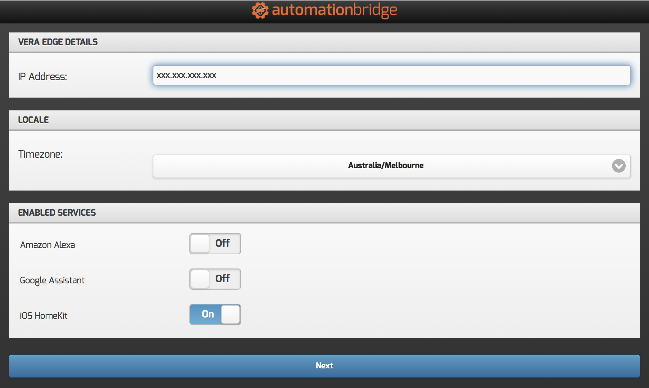 Next, enter the details for your Vera, select your time zone, and enable the required services.