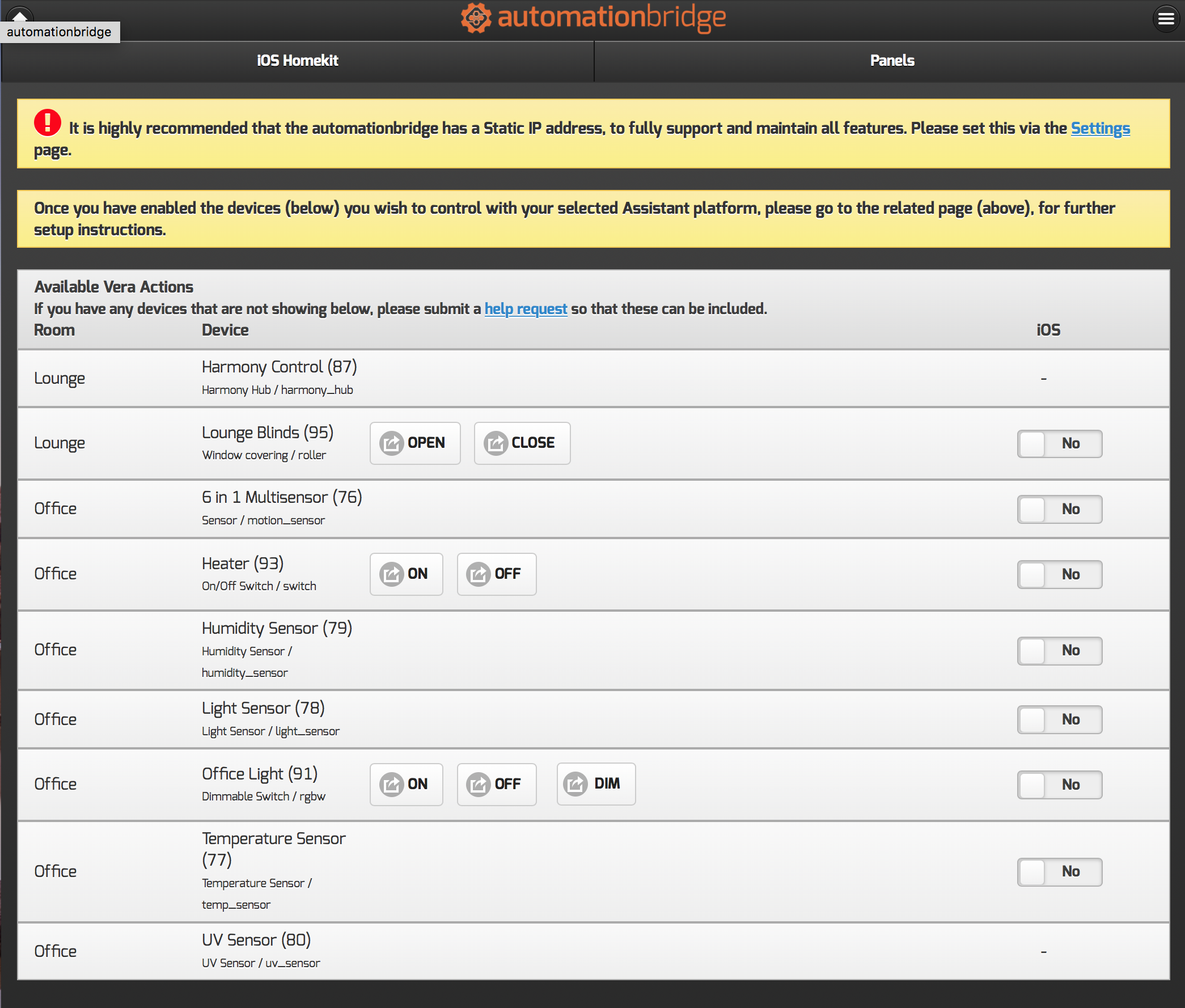 Once the bridge has restarted, you can then enable the required devices from the home page by clicking the slider to enable as needed, when all devices have been enabled, make sure to click the button to apply the changes.