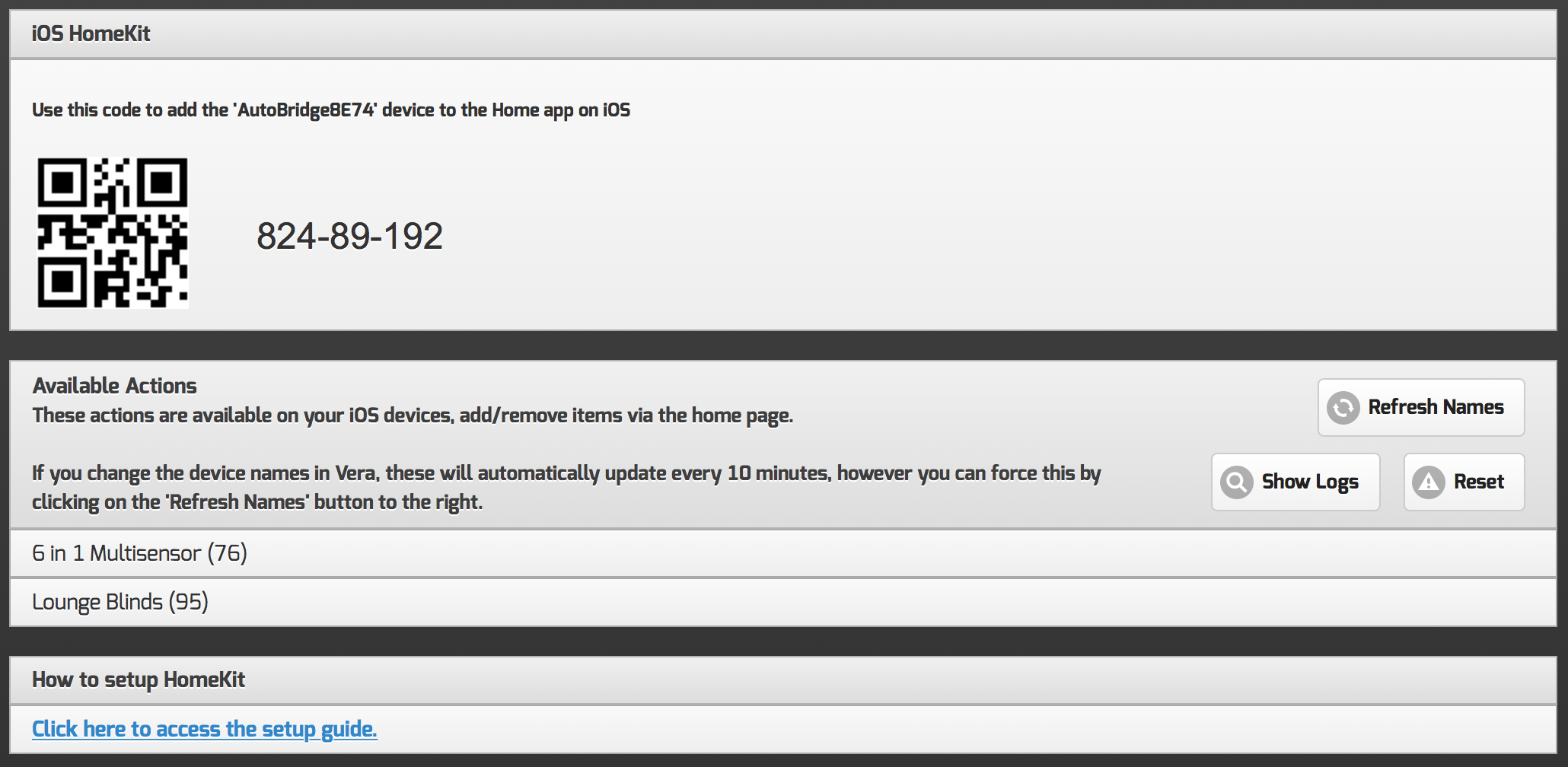 Reset – This will reset the Homekit backend, disabling all devices, and generating a new code. If this is done, you will need to remove the old AutoBridgeXXXX from your Home app and re-add it using the new code.