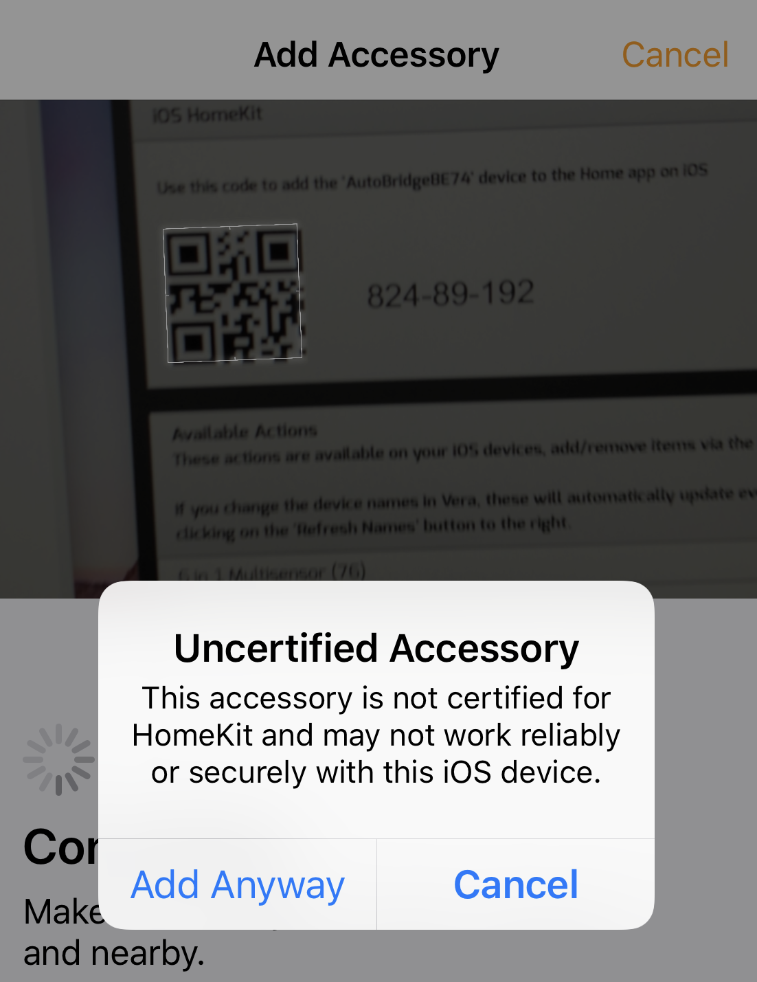 You can hold the camera on your device up to the screen and the code will scan (you will get a warning that this is an Uncertified Accessory, just press Add Anyway to continue)