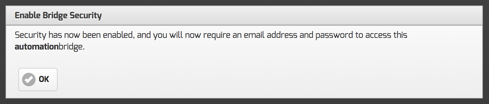 The automationbridge can be protected on your local network using a username (email address) and password.