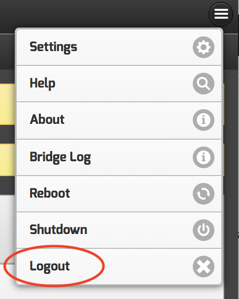 To log out, and secure the bridge, click the menu icon at the top right of the page, and choose Logout,