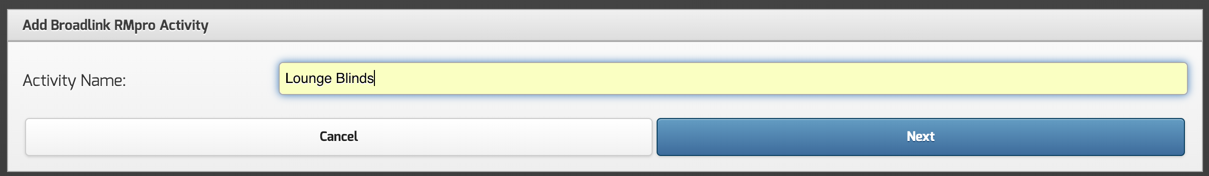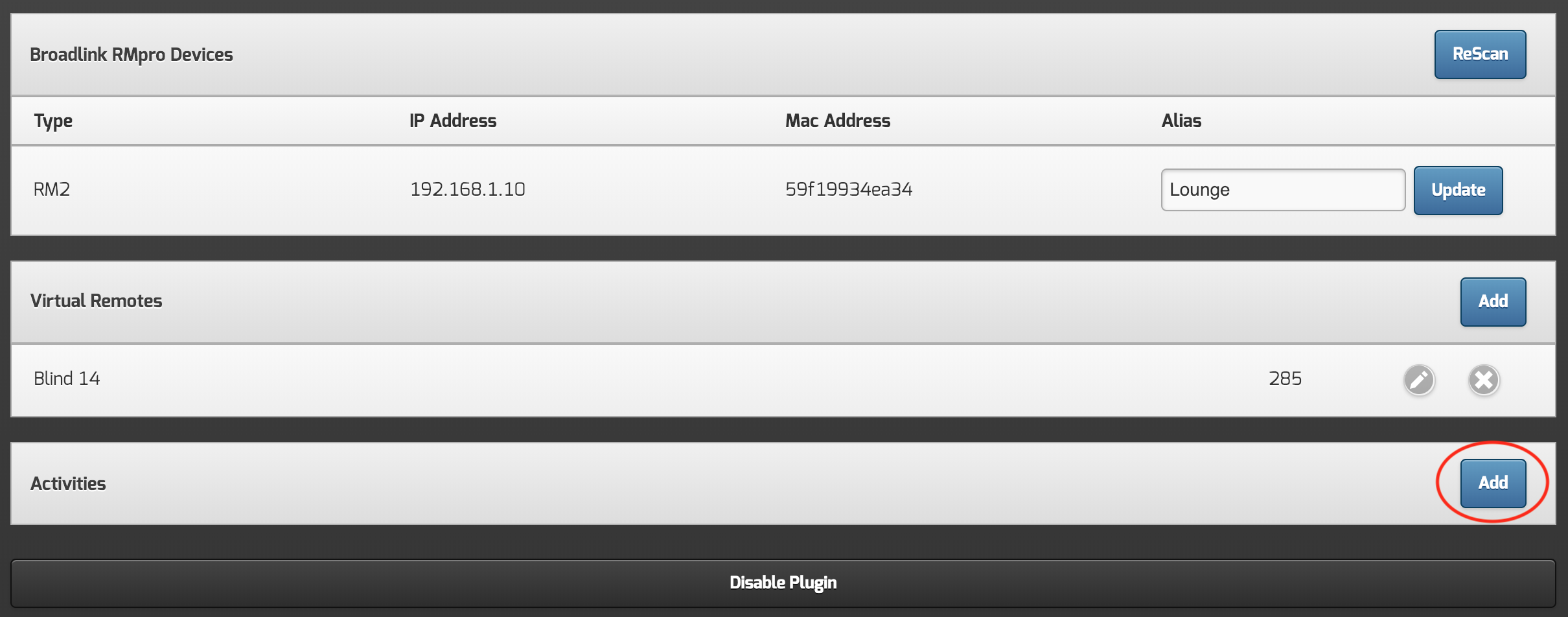 Start on the Settings page of the Broadlink plugin, bu clicking the Add button in the Activities section.