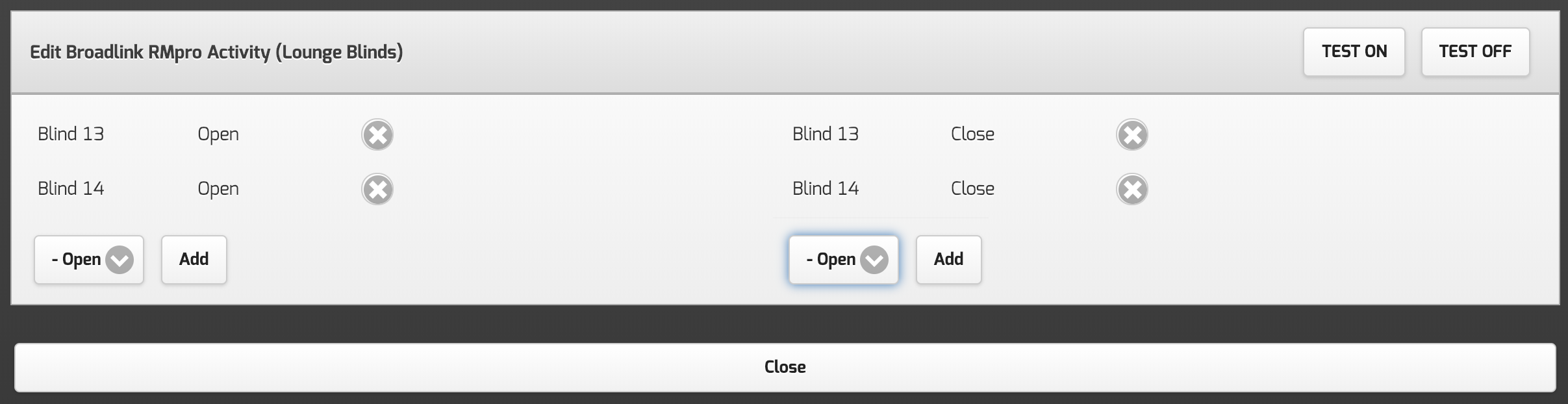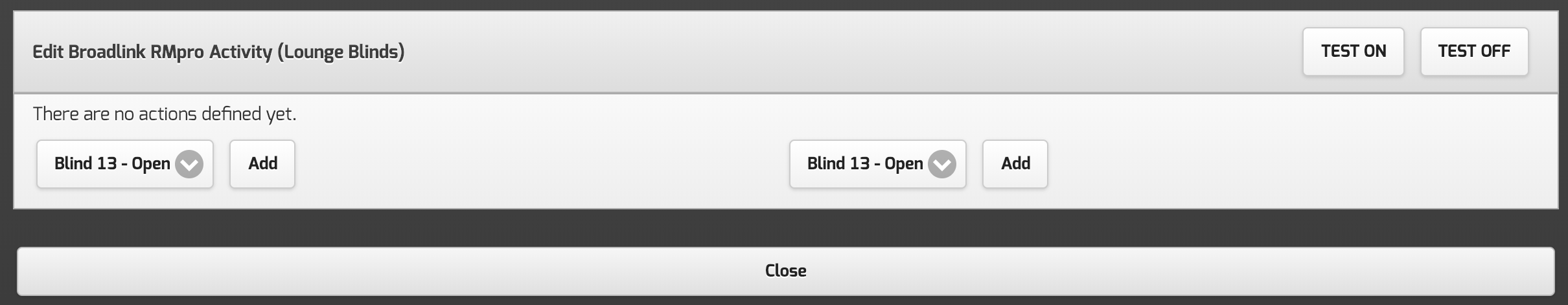 When complete it will look something like the above, with a sequence of RF actions for each ON & OFF. You will find buttons at the top right, where you can test the sequences to make sure they are correct and as expected.