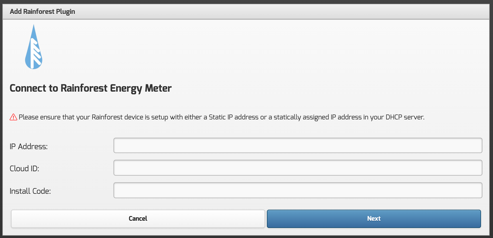 This guide assumes that you have already purchased the Rainforest plugin from within the automationbridge interface, and that you have setup the Rainforest device on your network.