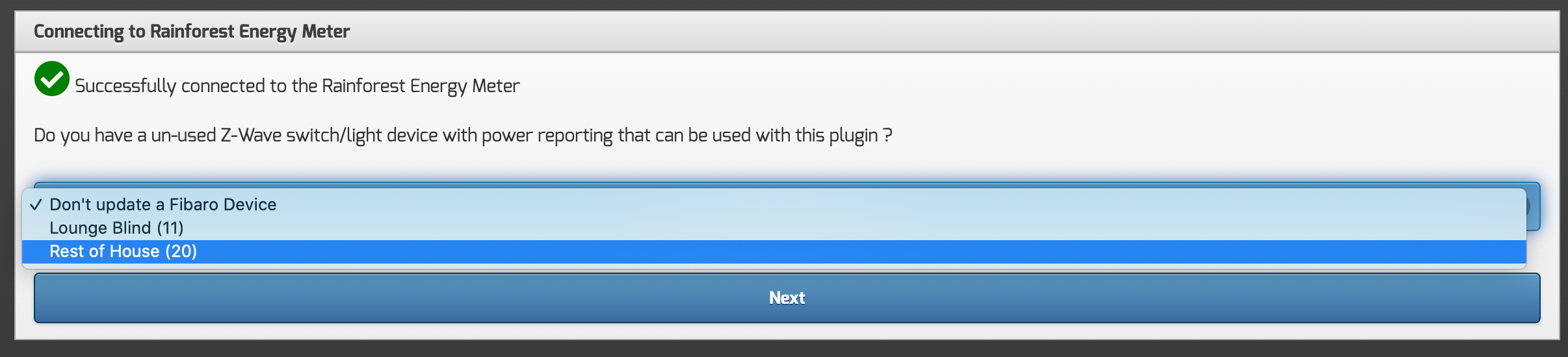 If you have a spare z-wave switch or plug (a good idea is to use a dual fibaro switch module, for a single light, leaving the 2nd channel spare) you can select it, and the plugin will then update the power (watts) and kWh into that device, therefore making the energy usage part of the Fibaro Energy Panel.