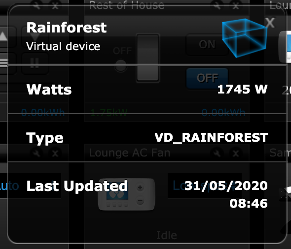 This VD will be updated every 20 seconds with the wattage reading from your Rainforest device. If you selected to update a native fibaro device with the energy usage, you will find this is also updated every 20 seconds.
