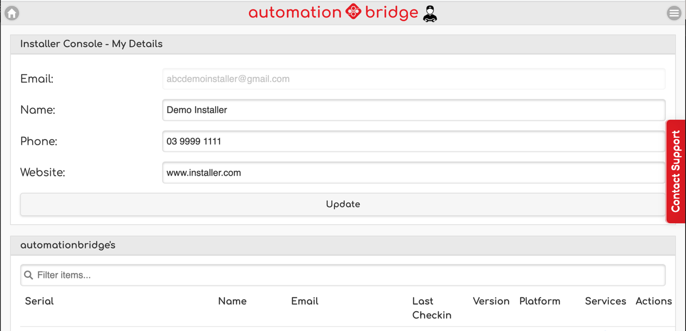 The installer console is a feature available to professional installers only. It will allow you to link all your installed automationbridge units to your installer account, allowing you to monitor and remotely access for support.